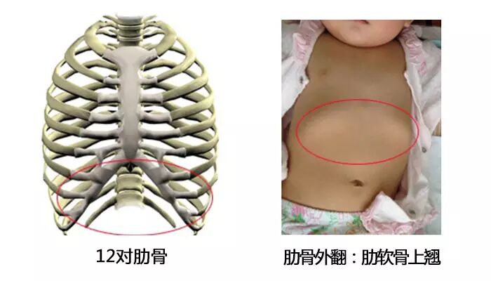 让孩子平卧,最下缘的肋骨超出身体的外缘,就叫做肋骨外翻。婴儿肋骨有个生理性外翻,随着发育会逐渐接近成人,但不注意营养就可能出问题,以后即使练胸腹肌肉也很难弥补。