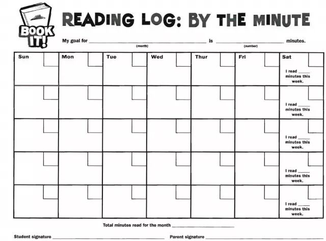 除了周记录单以外,还可以使用月记录单。下面是我去年使用的月记录单。每个月的第一天我会填好日期,发出新的记录单。这样孩子也可以自己统计每周、每月一共阅读了多少分钟。