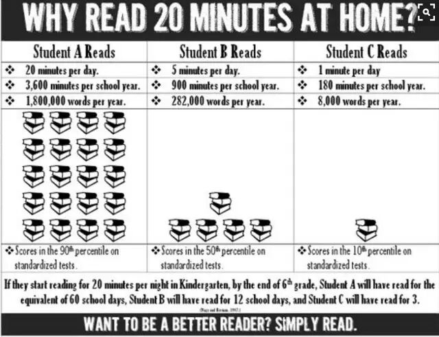 研究表示,大量的Read aloud(大声朗读) 可以帮助孩子提高理解的能力。如果一个学生每天读20分钟,那么一个学年他会读3600分钟,相当一年会读1,800,000个字, 也就是20本书。数据表示能坚持的孩子在每年的美国州考中起码能在英文测试中成绩超过90%的孩子。如果孩子每天只读5分钟书,那么他一年也就读5本书,在州考中成绩大概在50%左右。如果每天仅仅读一分钟书,相当于每年才读一本书,他的水平在美国州考整体水平中将位于10%左右的水平。