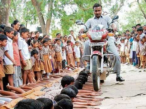 一群印度孩子平躺在地上,将自己的手臂向前伸。一名男子骑着摩托车从他们的手上轧过去。