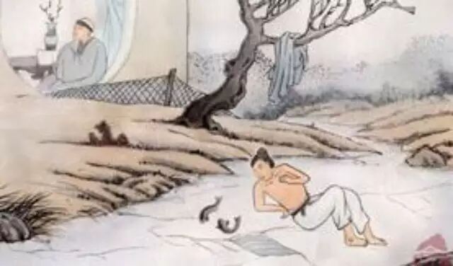 中国古代有一本流传甚广的童蒙读物,叫做《二十四孝》,相传是元代郭守正所揖。书中有一则故事,叫做“卧冰求鲤”,是这样说的:“晋王祥,字休征。早丧母,继母朱氏不慈,……尝欲食生鱼,时天寒冰冻,祥解衣卧冰求之。冰忽自解,双鲤跃出,持归供母。诗曰:继母人间有,王祥天下无;至今河水上,一片卧冰模。”王祥本有其人,西晋琅琊(今山东临沂)人,王羲之曾祖父王览的同父异母兄,以孝著称。
