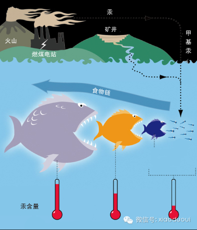 当汞进入大海后,其中的一部分会被海流冲到近海区域,还有一部分会以挥发和降水的方式在海陆空之间往复循环。这部分汞最终有可能会埋在沉积物中,也有可能和稳定的无机化合物结合,从而脱离这个循环系统。然而,在此之前,大部分汞会进入海洋生物的食物链中。在海水里,一些汞会被细菌转化为甲基汞汞毒性最强的一种形态, 并在整个食物链中累积下来。甲基汞形成时,首先会被海里的微生物藻类吸收,藻类又会被浮游动物吃掉,浮游动物又会被小鱼吞食,小鱼又会成为大鱼的腹中美味。越是在食物链顶部的生物体,其体内的甲基汞浓度越高。