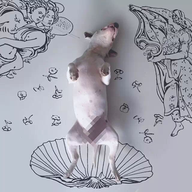 另外,为了给“Jimmy Choo”创造一种更温(dou)和(bi)的“狗”格,他的主人便发挥起了自己的摄影和插画才能,“Jimmy Choo”便在一些简易的场景中成了百变大咖。从行为艺术家、超级英雄、到和平使者、还有文艺复兴名画主角……