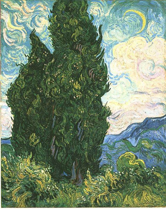 当梵高进入圣雷米精神病院治疗后,他的心境出现了明显的变化。他创作的风景有时激荡有时平静;在这里我们看到了悸动与控制的强烈对撞,这种对撞在《星夜》所传达的渺茫的希望中达到顶峰。