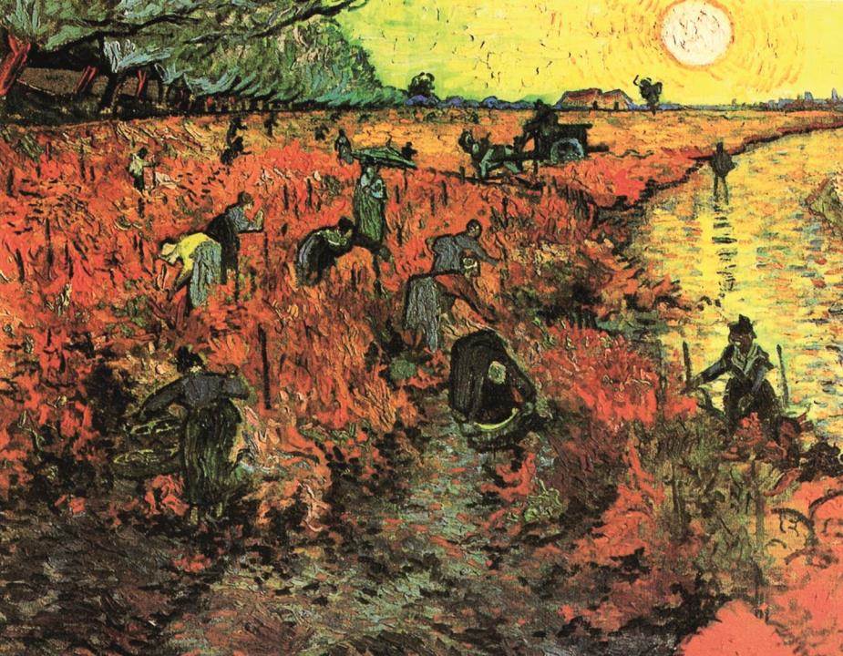 法国南部,向来以阳光灿烂著称。向日葵主题几乎成了梵高标签,为了欢迎他的朋友高更到来,梵高用这些向日葵来装饰他们的房间。在法国南部的阳光炙热烘烤下,高光凸显,用色大胆,突破当时的一切禁忌,成像于画布上,几乎就是太阳本身。梵高先后在阿尔勒和巴黎多次画过这个主题,其中有三幅《十五朵向日葵》是在金黄色背景下描绘金黄色的花朵,灿烂夺目。其中尤以日本富商在佳士得拍得那一幅最为著名,当时约4000万美元的天价,一下子吸引了全世界的目光。