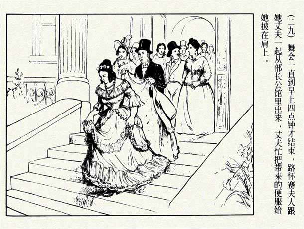 他怕她出门受寒,把带来的衣服披在她的肩上,那是平日穿的家常衣服,那一种寒伦气和漂亮的舞装是非常不相称的。她马上感觉到这一点,为了不叫旁边的那些裹在豪华皮衣里的太太们注意,她就急着想要跑出大门。