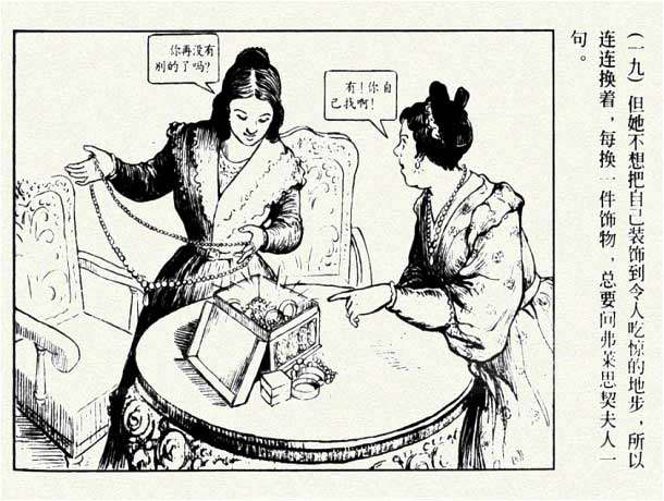 “不行……在那些阔太太中间,显出一副穷酸相,再没有比这更丢脸的了。”她的丈夫突然喊了起来:“你可真算是糊涂!为什么不去找你的朋友佛来思节夫人,跟她借几样首饰呢?拿你跟她的交情来说,是可以开口的。”