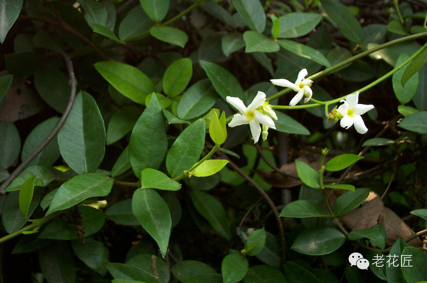 常绿木质藤本,长有气生根,常攀缘在树木、岩石墙垣上生长;单叶对生,椭圆形至阔披针形,长2.5厘米至6厘米,先端尖,革质,叶面光滑,叶背有毛,叶柄很短。初夏5月开白色花,花冠高脚碟状,5裂,裂片偏斜呈螺旋形排列,略似“卐”字,芳香。