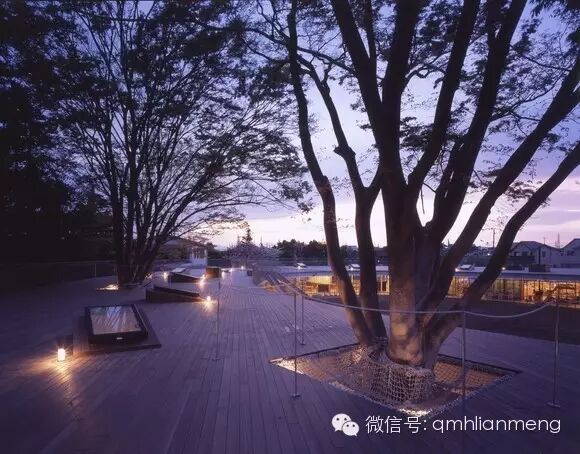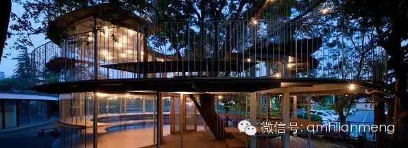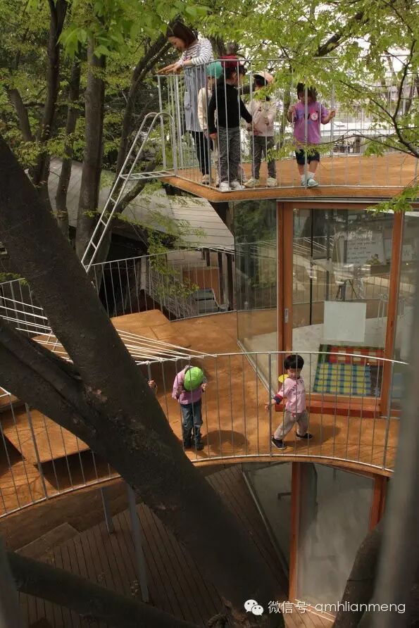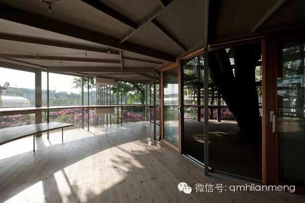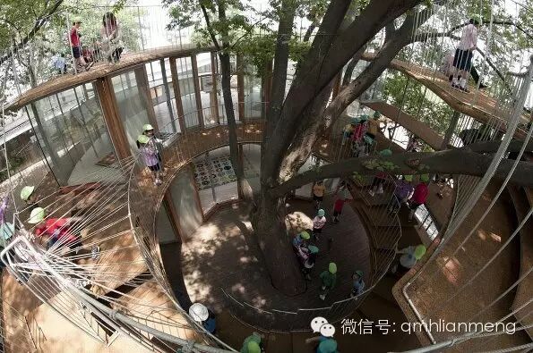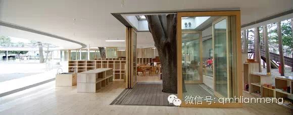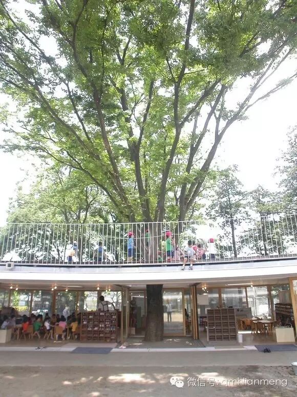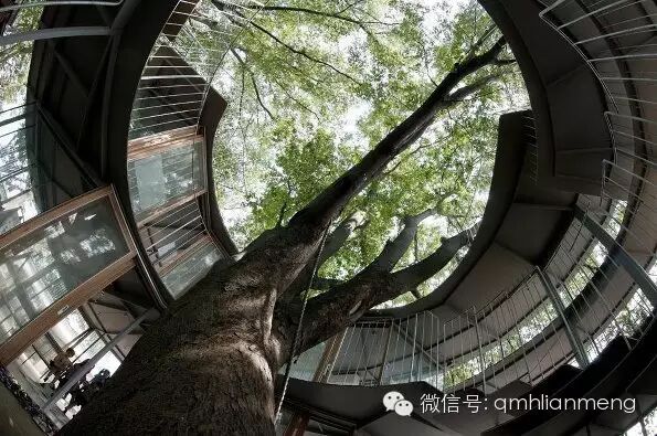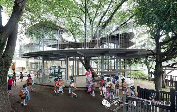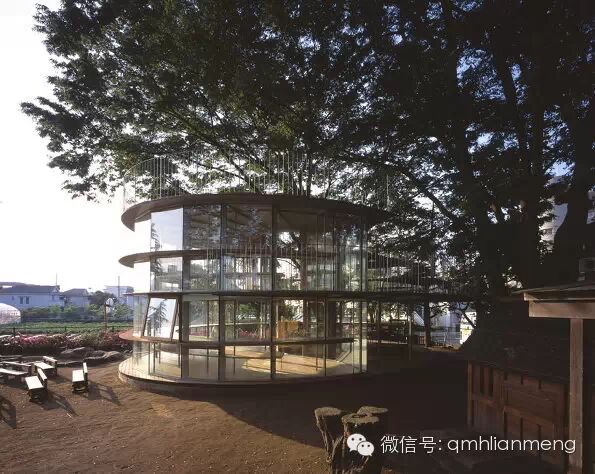 最大的一棵榉树生长在校舍的另一端,由通明透亮的玻璃墙绕着大树,围成一个圆筒形的候车亭。亭内一楼安置着长条坐凳,给等车的孩子们用。亭顶则和校舍的屋顶相通。