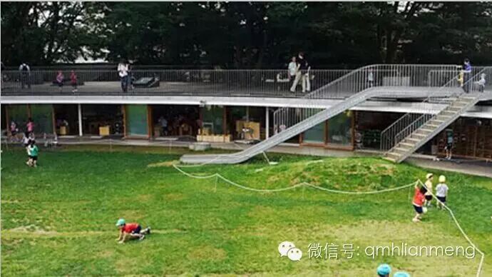 内侧屋顶高度仅为2.1米,老师站在院子里就可以看到屋顶孩子的一举一动,屋顶水槽的设计也很独到,留有4个溢水口,孩子们下雨天可以看到瀑布。